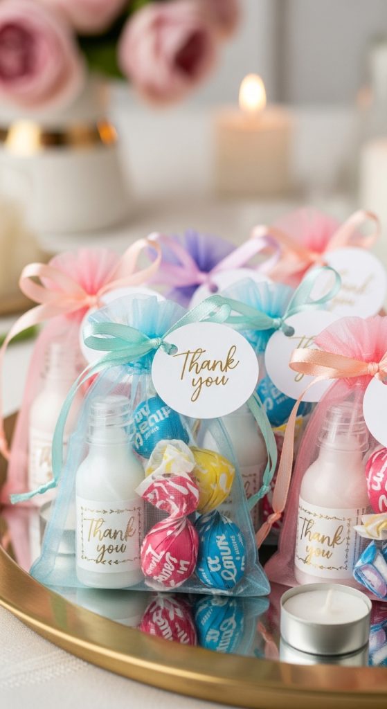 Fill each bag or jar with 2–3 small items and top off with a thank-you tag. Use pastel ribbon and stickers from the craft aisle to decorate.
