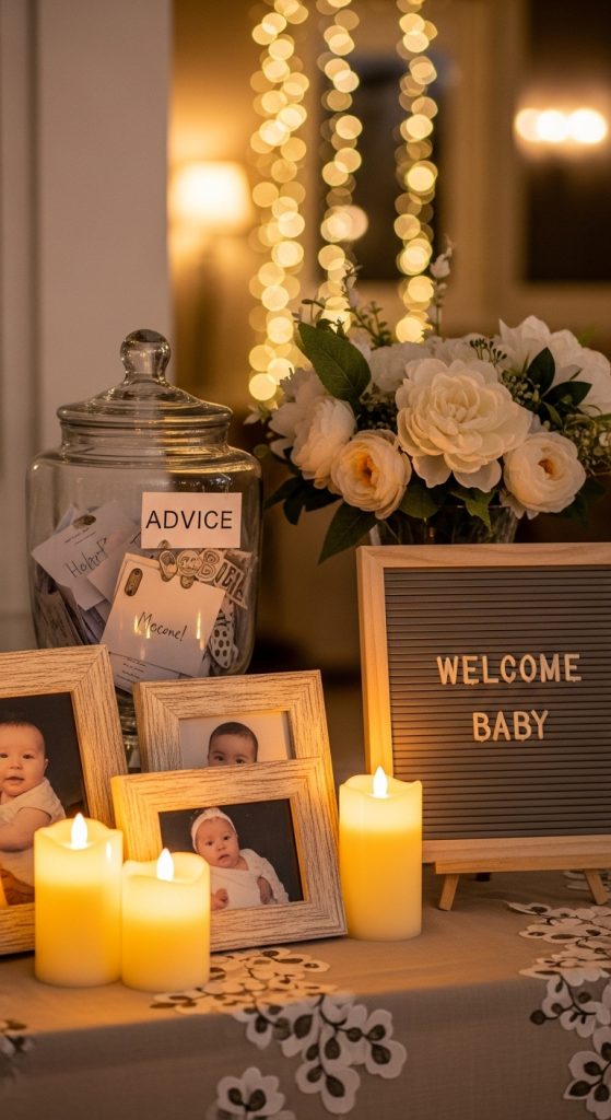 Set up a small table near the entrance that welcomes guests with glowing candles, baby pictures of the parents, and a letterboard that says something sweet like “Welcome Baby Smith!”