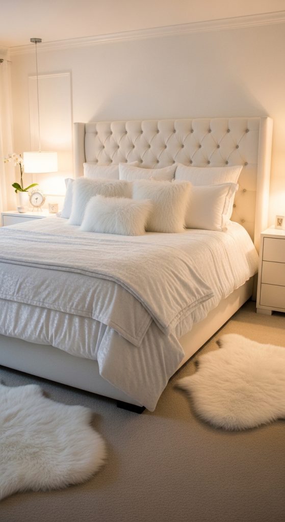 Luxury isn’t just about looks; it’s about comfort. In an all-white bedroom, layering textures is key to creating depth and richness. Think plush velvet or linen bedding, faux fur throws, and soft, patterned rugs. The mix of tactile textures will make the white space feel warm, inviting, and indulgent without compromising the serene color palette. Add a tufted headboard in white leather or fabric to elevate the sophistication.