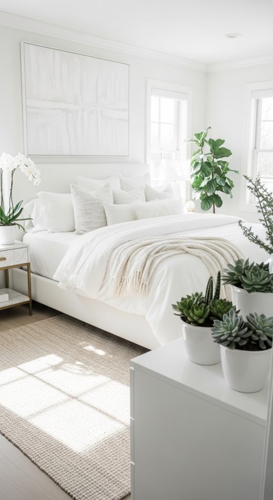 While all-white rooms are stunning, adding a touch of natural greenery brings life and balance. A tall potted plant, a vase of white orchids, or a small succulent arrangement can introduce freshness and break the monochrome monotony. Keep plant pots white or neutral to maintain the serene, high-end aesthetic.