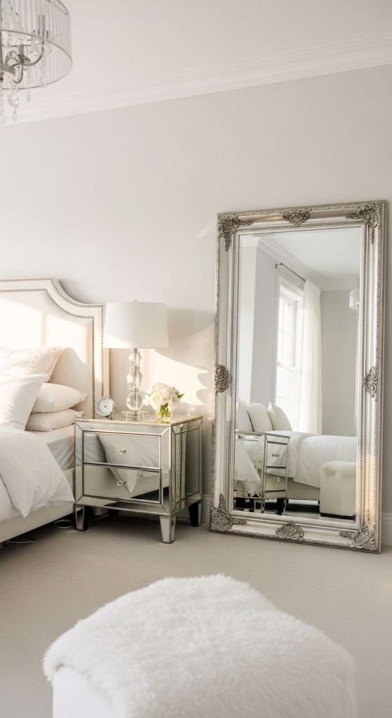 Mirrors amplify light and add a glamorous touch. Incorporate mirrored nightstands, dressers, or an ornate full-length mirror. The reflections enhance the all-white theme, giving the room an airy, expansive feel. Choose sleek designs with silver or crystal detailing to enhance the luxe factor without overwhelming the calm ambiance.