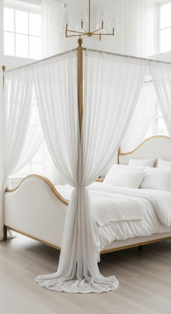 A canopy bed is the ultimate symbol of luxury, and in an all-white setting, it becomes ethereal. Choose sheer white drapes cascading from the canopy frame for a dreamy, romantic vibe. Pair it with crisp white sheets, fluffy pillows, and subtle gold or silver accents on the bed frame to create a masterpiece that feels regal yet relaxing.
