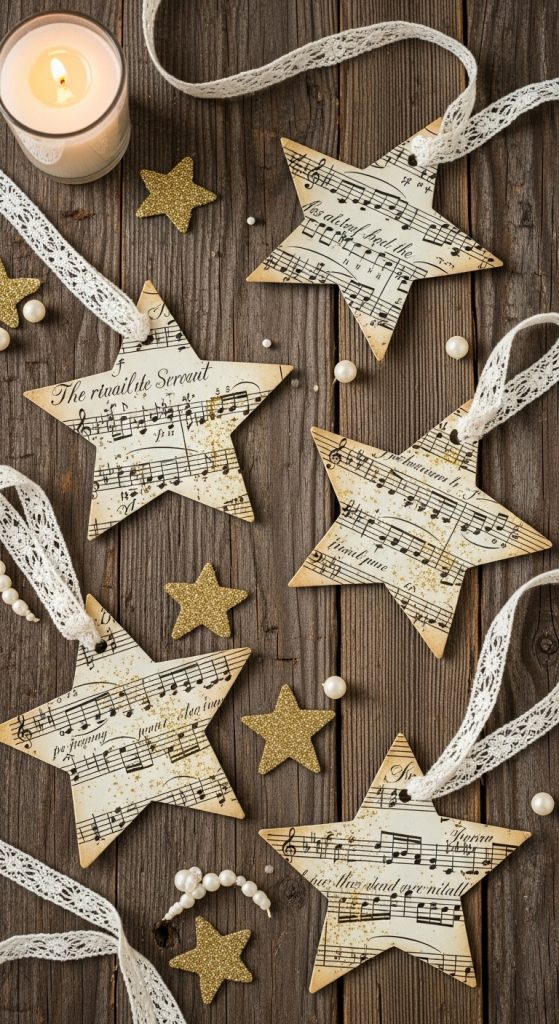 Old sheet music or printed pages can be turned into gorgeous folded stars or snowflakes.