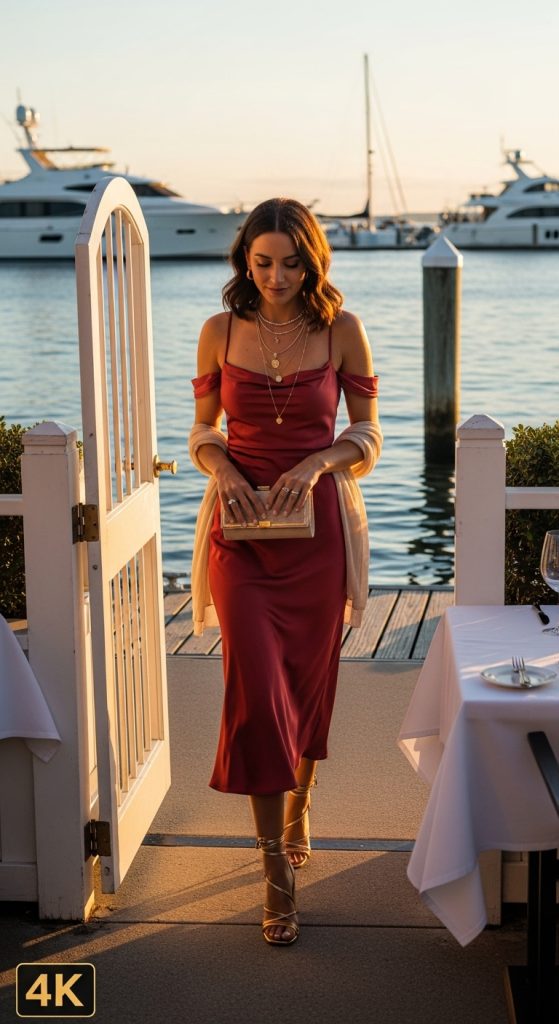 Choose dresses with movement—ruffles, wrap styles, or pleats give that “effortlessly thrown together” elegance Newport is known for.